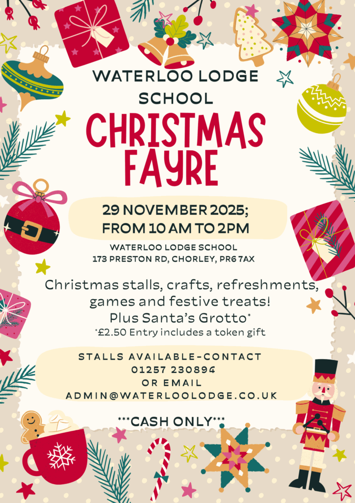 Get ready for some festive fun! We’re excited to invite you to our Waterloo Lodge School Christmas Fayre on Saturday 29th November 2025, from 10:00am to 2:00pm here at school.